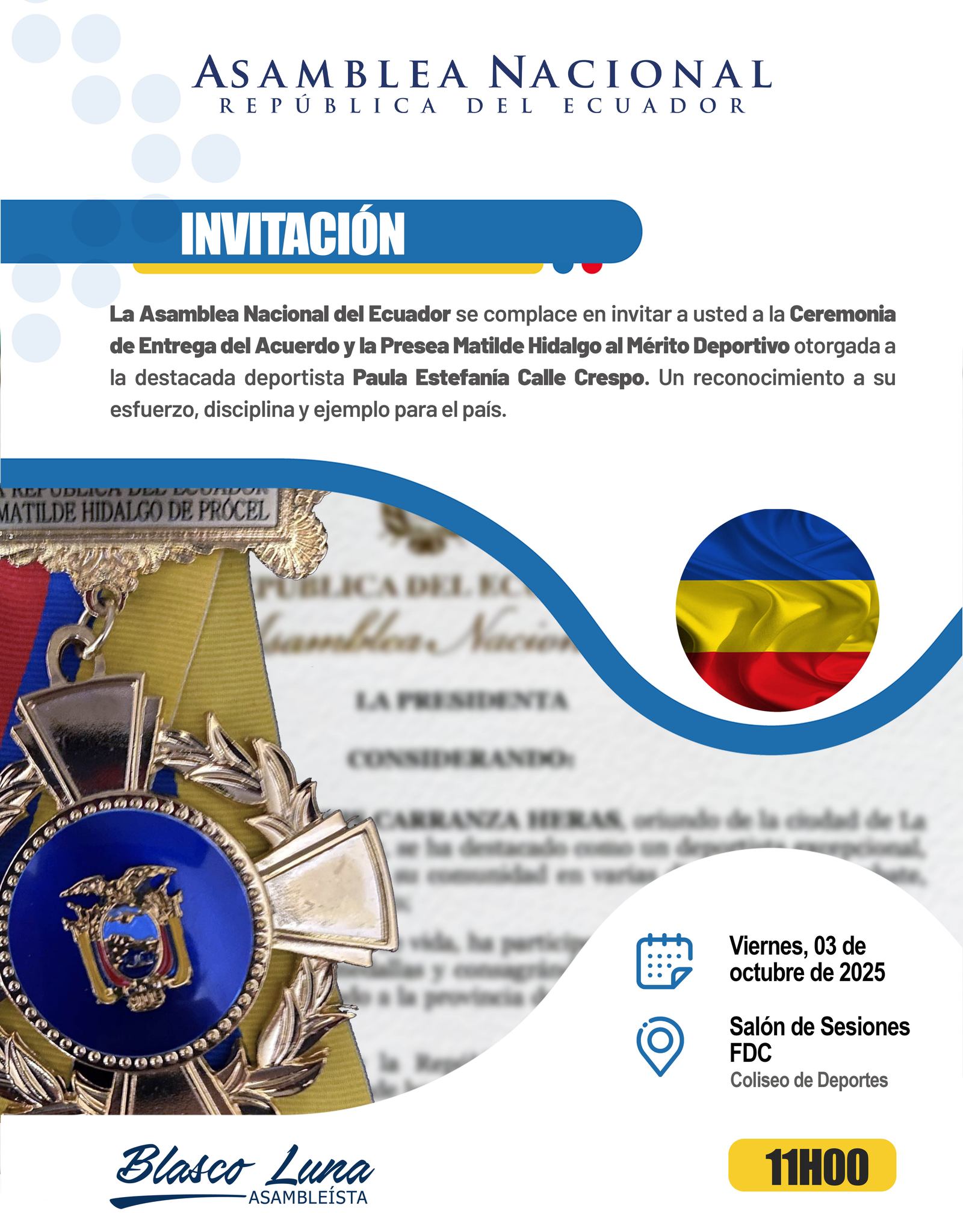 Tengo el honor de invitar a la Usted al acto solemne de Entrega del Acuerdo y la Presea Matilde Hidalgo al Mérito Deportivo a la destacada deportista Paula Estefanía Calle Crespo, en reconocimiento a su brillante trayectoria y logros que enorgullecen a la provincia del Cañar y al Ecuador.