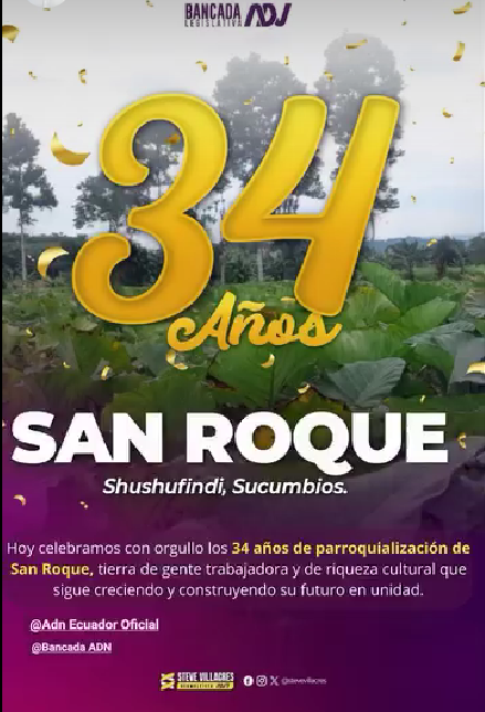 Hoy celebramos con orgullo los 34 años de parroquialización de San Roque, en el cantón Shushufindi, una tierra de gente trabajadora, solidaria y comprometida con el desarrollo de Sucumbíos.