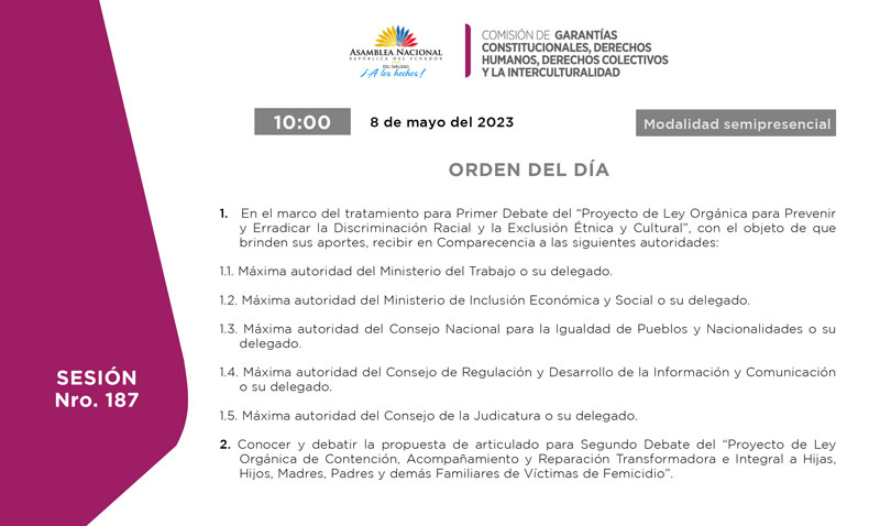 1. En el marco del tratamiento para Primer Debate del “Proyecto de Ley Orgánica para Prevenir y Erradicar la Discriminación Racial y la Exclusión Étnica y Cultural”, con el objeto de que brinden sus aportes, recibir en Comparecencia a las siguientes autoridades: