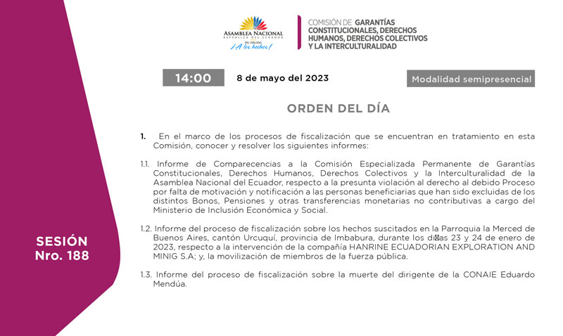 1.2. Informe del proceso de fiscalización sobre los hechos suscitados en la Parroquia la Merced de Buenos Aires, cantón Urcuquí, provincia de Imbabura, durante los dı́as 23 y 24 de enero de 2023, respecto a la intervención de la compañía HANRINE ECUADORIAN EXPLORATION AND MINIG S.A; y, la movilización de miembros de la fuerza pública.