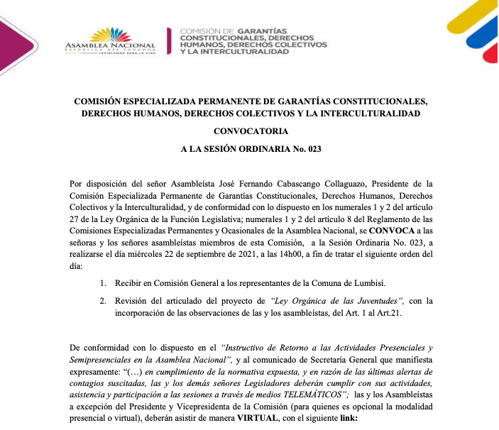 Por disposición del señor Asambleísta José Fernando Cabascango Collaguazo, Presidente de la Comisión Especializada Permanente de Garantías Constitucionales, Derechos Humanos, Derechos Colectivos y la Interculturalidad, y de conformidad con lo dispuesto en los numerales 1 y 2 del artículo 27 de la Ley Orgánica de la Función Legislativa; numerales 1 y 2 del artículo 8 del Reglamento de las Comisiones Especializadas Permanentes y Ocasionales de la Asamblea Nacional, se CONVOCA a las señoras y los señores asambleístas miembros de esta Comisión, a la Sesión Ordinaria No. 023, a realizarse el día miércoles 22 de septiembre de 2021, a las 14h00, a fin de tratar el siguiente orden del día: