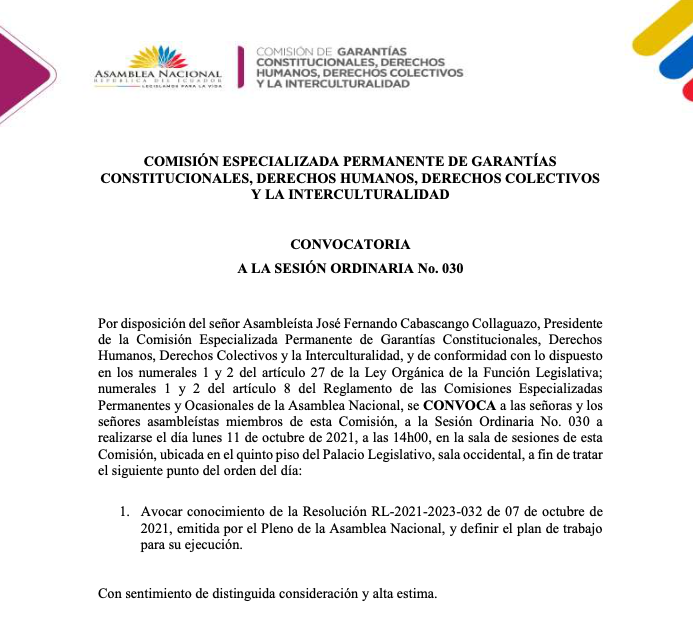 Por disposición del señor Asambleísta José Fernando Cabascango Collaguazo, Presidente de la Comisión Especializada Permanente de Garantías Constitucionales, Derechos Humanos, Derechos Colectivos y la Interculturalidad, y de conformidad con lo dispuesto en los numerales 1 y 2 del artículo 27 de la Ley Orgánica de la Función Legislativa; numerales 1 y 2 del artículo 8 del Reglamento de las Comisiones Especializadas Permanentes y Ocasionales de la Asamblea Nacional, se CONVOCA a las señoras y los señores asambleístas miembros de esta Comisión, a la Sesión Ordinaria No. 030 a realizarse el día lunes 11 de octubre de 2021, a las 14h00, en la sala de sesiones de esta Comisión, ubicada en el quinto piso del Palacio Legislativo, sala occidental, a fin de tratar el siguiente punto del orden del día: