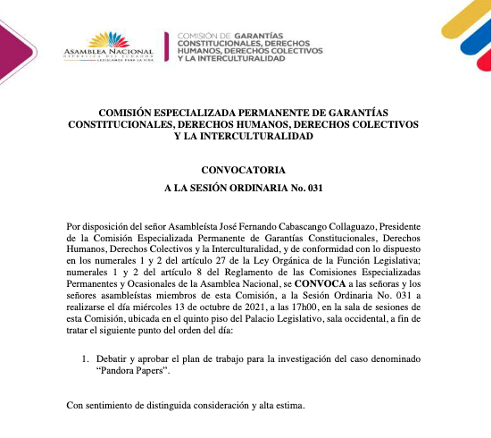 Por disposición del señor Asambleísta José Fernando Cabascango Collaguazo, Presidente de la Comisión Especializada Permanente de Garantías Constitucionales, Derechos Humanos, Derechos Colectivos y la Interculturalidad, y de conformidad con lo dispuesto en los numerales 1 y 2 del artículo 27 de la Ley Orgánica de la Función Legislativa; numerales 1 y 2 del artículo 8 del Reglamento de las Comisiones Especializadas Permanentes y Ocasionales de la Asamblea Nacional, se CONVOCA a las señoras y los señores asambleístas miembros de esta Comisión, a la Sesión Ordinaria No. 031 a realizarse el día miércoles 13 de octubre de 2021, a las 17h00, en la sala de sesiones de esta Comisión, ubicada en el quinto piso del Palacio Legislativo, sala occidental, a fin de tratar el siguiente punto del orden del día: