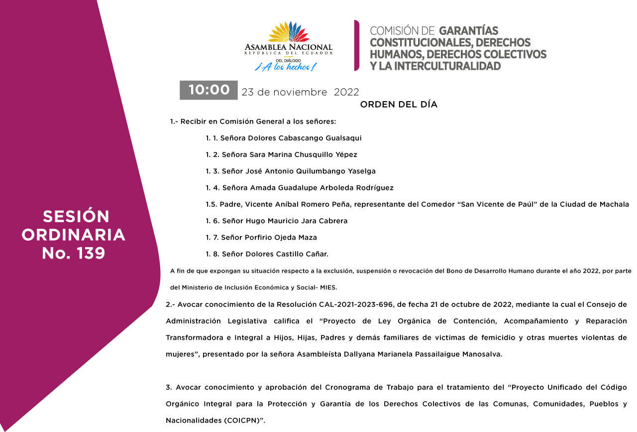 En el orden del día se recibe en comisión, a un comisión por la exclusión, suspensión o revocación del bono de desarrollo humano del año 2022, después de tener varias versiones de personas afectadas al bono de desarrollo humana se propone en moción