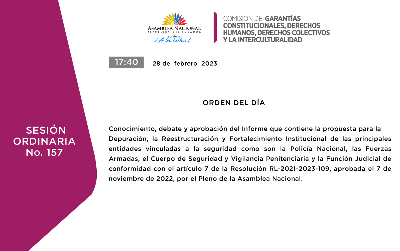 Por disposición de la señora Victoria Tatiana Desintonio Malavé, Presidenta (E) de la Comisión Especializada Permanente de Garantías Constitucionales, Derechos Humanos, Derechos Colectivos y la Interculturalidad, y de conformidad con lo dispuesto en el artículo 27, numerales 1 y 2 de la Ley Orgánica de la Función Legislativa; y, artículo 9, numerales 1 y 2 del Reglamento de las Comisiones Especializadas Permanentes y Ocasionales de la Asamblea Nacional, se CONVOCA a las señoras y los señores Asambleístas miembros de esta Comisión, a la Sesión Nro. 157, misma que se realizará el día martes 28 de febrero de 2023, a las 17h40, en la sala de sesiones de esta Comisión, ubicada en el quinto piso ala occidental del Edificio Legislativo de la Asamblea Nacional, Avenida 6 de Diciembre y Piedrahita del cantón Quito, provincia de Pichincha, con el objeto de tratar el siguiente: