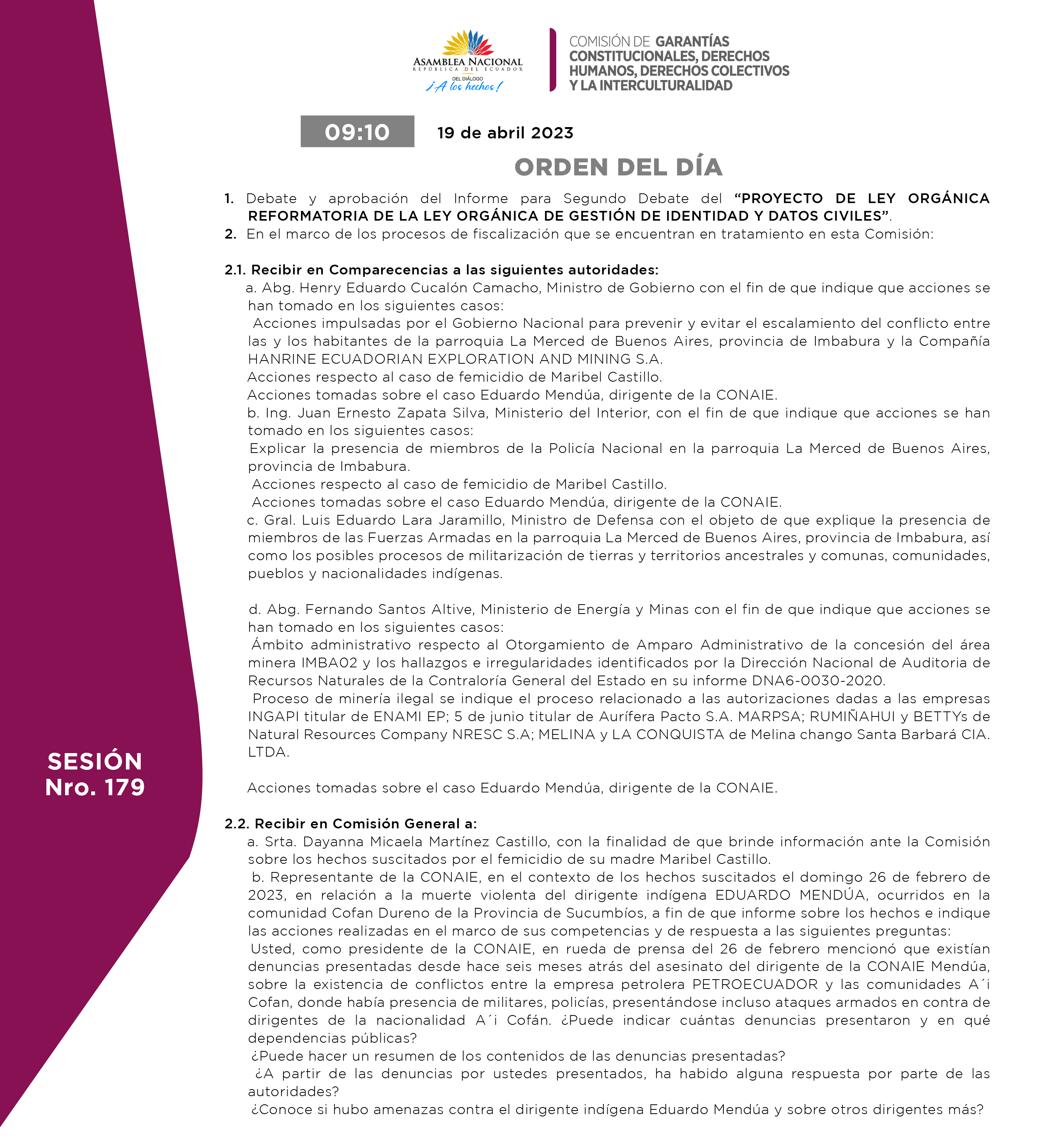 b. Representante de la CONAIE, en el contexto de los hechos suscitados el domingo 26 de febrero de 2023, en relación a la muerte violenta del dirigente indígena EDUARDO MENDÚA, ocurridos en la comunidad Cofan Dureno de la Provincia de Sucumbíos, a fin de que informe sobre los hechos e indique las acciones realizadas en el marco de sus competencias y de respuesta a las siguientes preguntas: