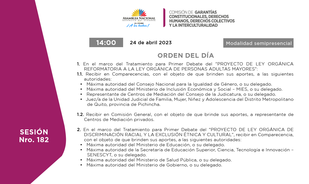 2. En el marco del Tratamiento para Primer Debate del “PROYECTO DE LEY ORGÁNICA DE DISCRIMINACIÓN RACIAL Y LA EXCLUSIÓN ÉTNICA Y CULTURAL”, recibir en Comparecencia, con el objeto de que brinden sus aportes, a las siguientes autoridades: