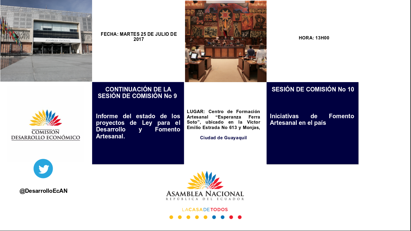 La Sesión número 10 se instaló inmediatamente y como principal punto se dio la palabra a las artesanas y artesanos de la provincia del Guayas. La ingeniera Lucciola Muentes Presidenta de la Asociación Interprofesional de Artesanos sin fronteras de la provincia del Guayas, Natalia Sicco Directora del Centro de Formación Artesanal Particular Esperanza Ferra Soto, Luis Quintanilla Presidente de la Junta Provincial de la Defensa del Artesano y Cristobal Mora Presidente de la Federación de Gremios y asociaciones de Artesanos del Guayas, expusieron la realidad local del sector artesanal, de las mujeres dedicadas a las artes y oficios, así como de la necesidad de una reforma integral de las normativas que les rigen para contar con medidas de apoyo específicas a los distintos sectores artesanales.