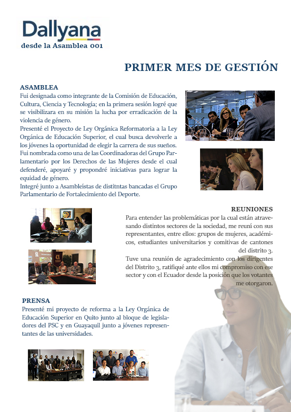 • Creadora y Excordinadora del Plan Estratégico “Amiga, ya no estás sola” y proponete de la Ordenanza de Prevención y Acción para Combatir la Violencia Contra las Mujeres en Guayaquil (2017)