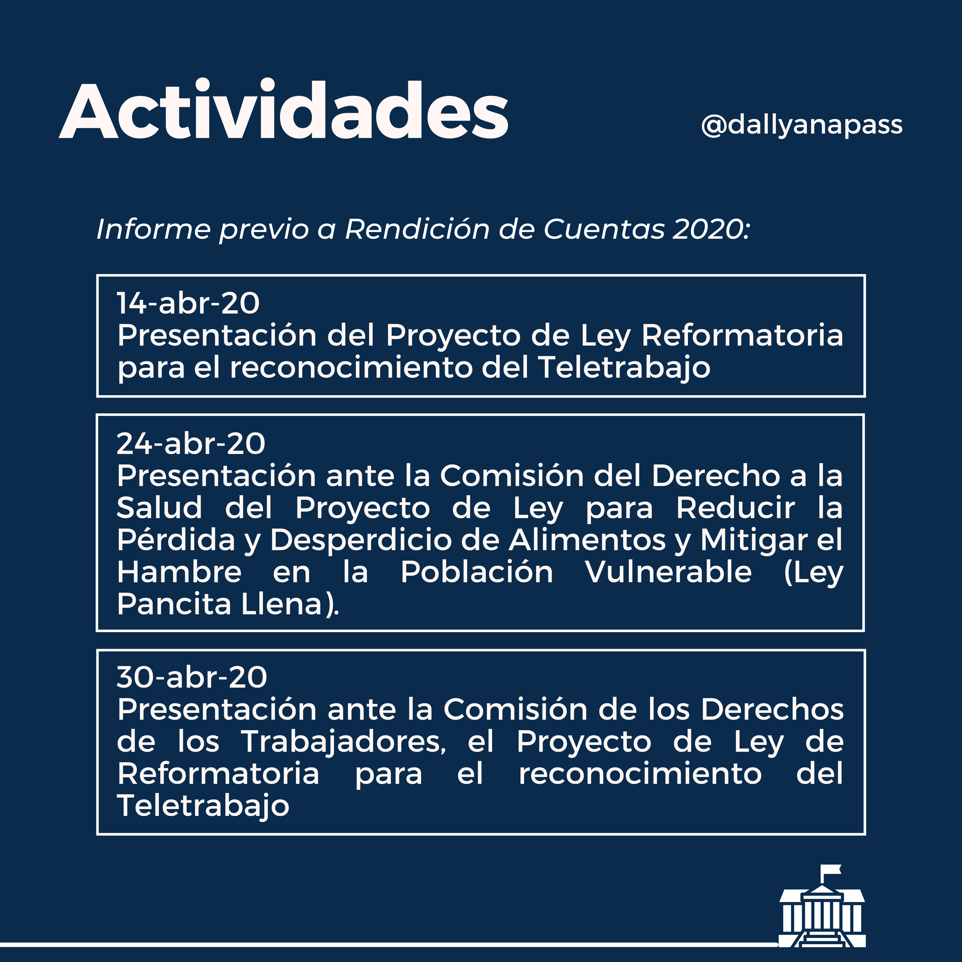 • Proponente del Proyecto de Ley para la Formalización del Teletrabajo, que garantiza que los trabajadores de esa modalidad cuenten con todos los beneficios de los trabajadores de contrato fijo.