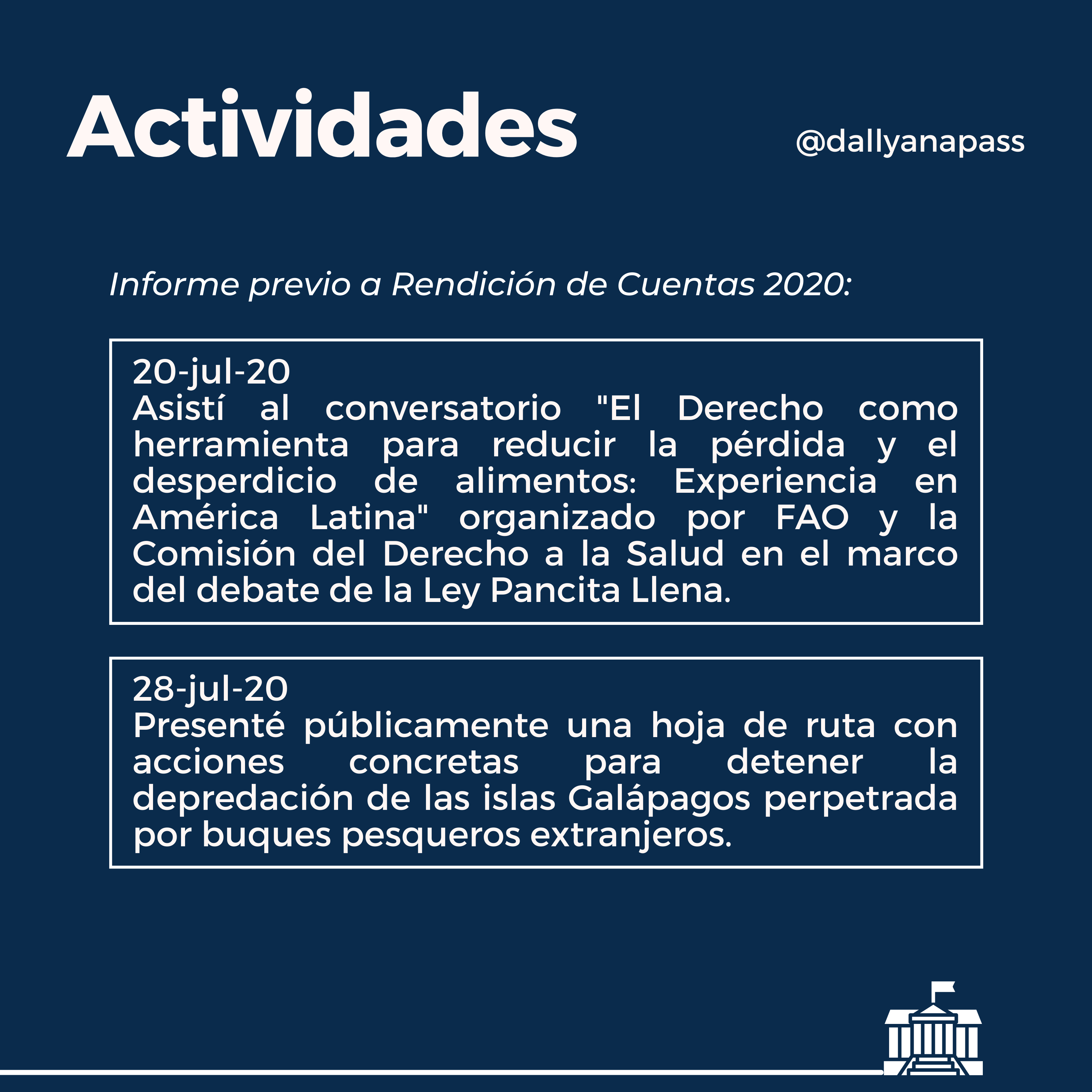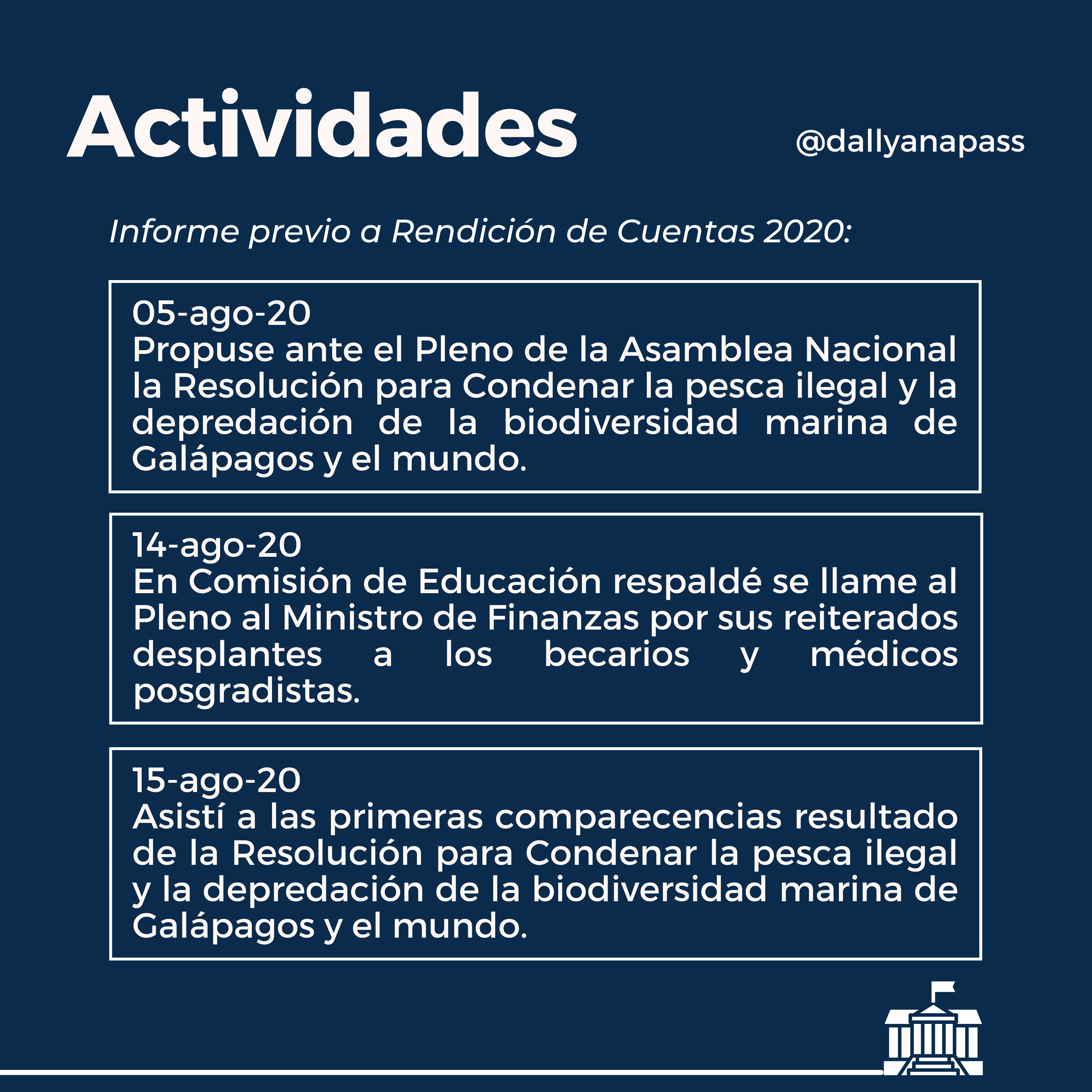• Proponente de la Resolución para condenar la pesca ilegal y la depredación de la biodiversidad marina de Galápagos y el mundo, que exhortaba a las autoridades a tomar medidas efectivas para evitar devastación perpetrada por buques pesqueros internacionales.