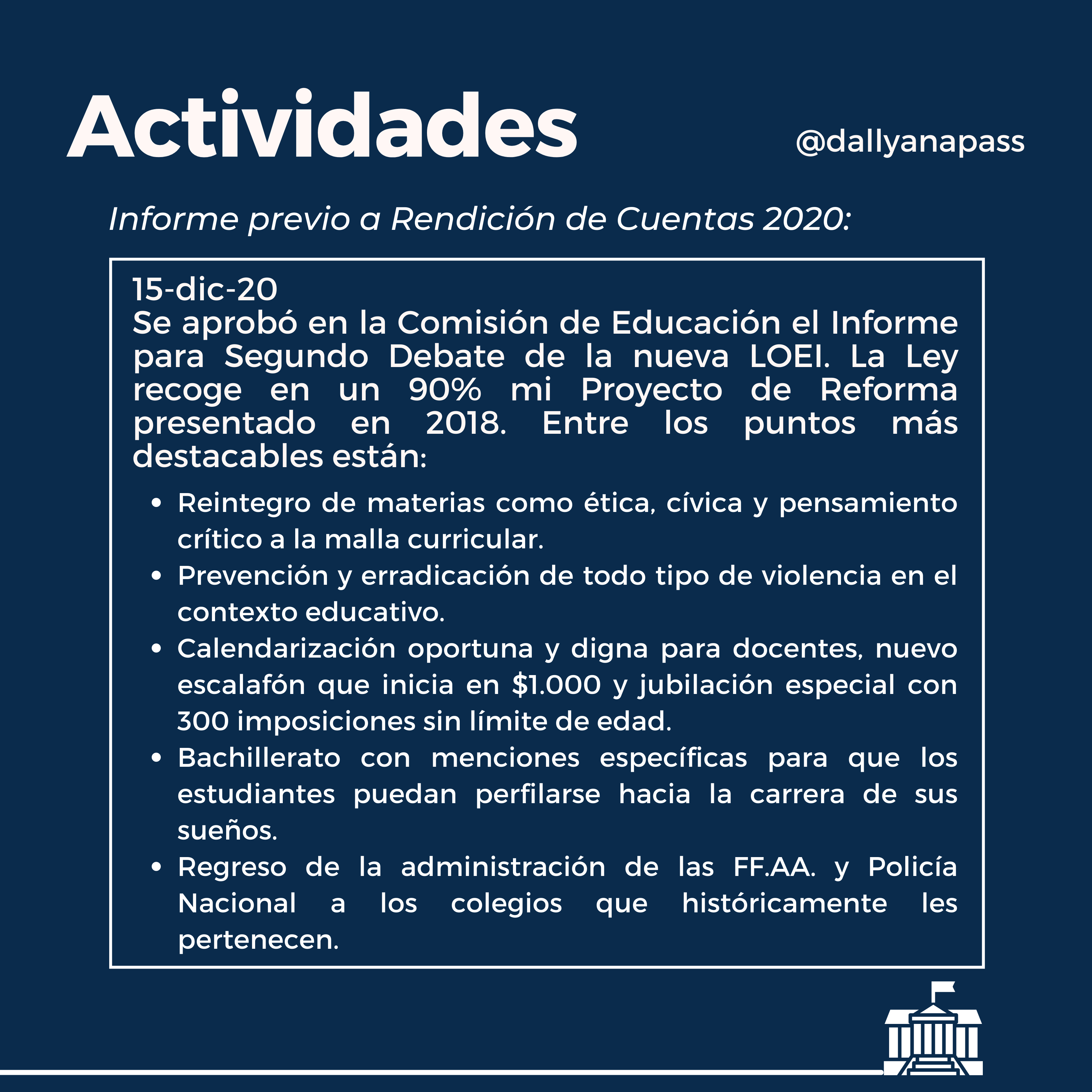 • Proponente de reformas a la Ley Orgánica de Educación Intercultural (LOEI) para lograr establecer un balance entre derechos y deberes de la comunidad educativa, dignificar el trabajo del docente, devolver materias que fomenten la lógica, cívica y ética, y fomentar una educación más personalizada. (Incluido en Ley vigente)