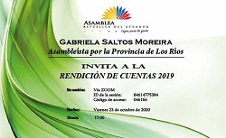 Gabriela Saltos Moreira, Asambleísta por la Provincia de Los Ríos, el próximo 23 de ocubre de 2020, presentará en acto publico vía plataforma virtual, la Rendición de Cuentas del período 2019.