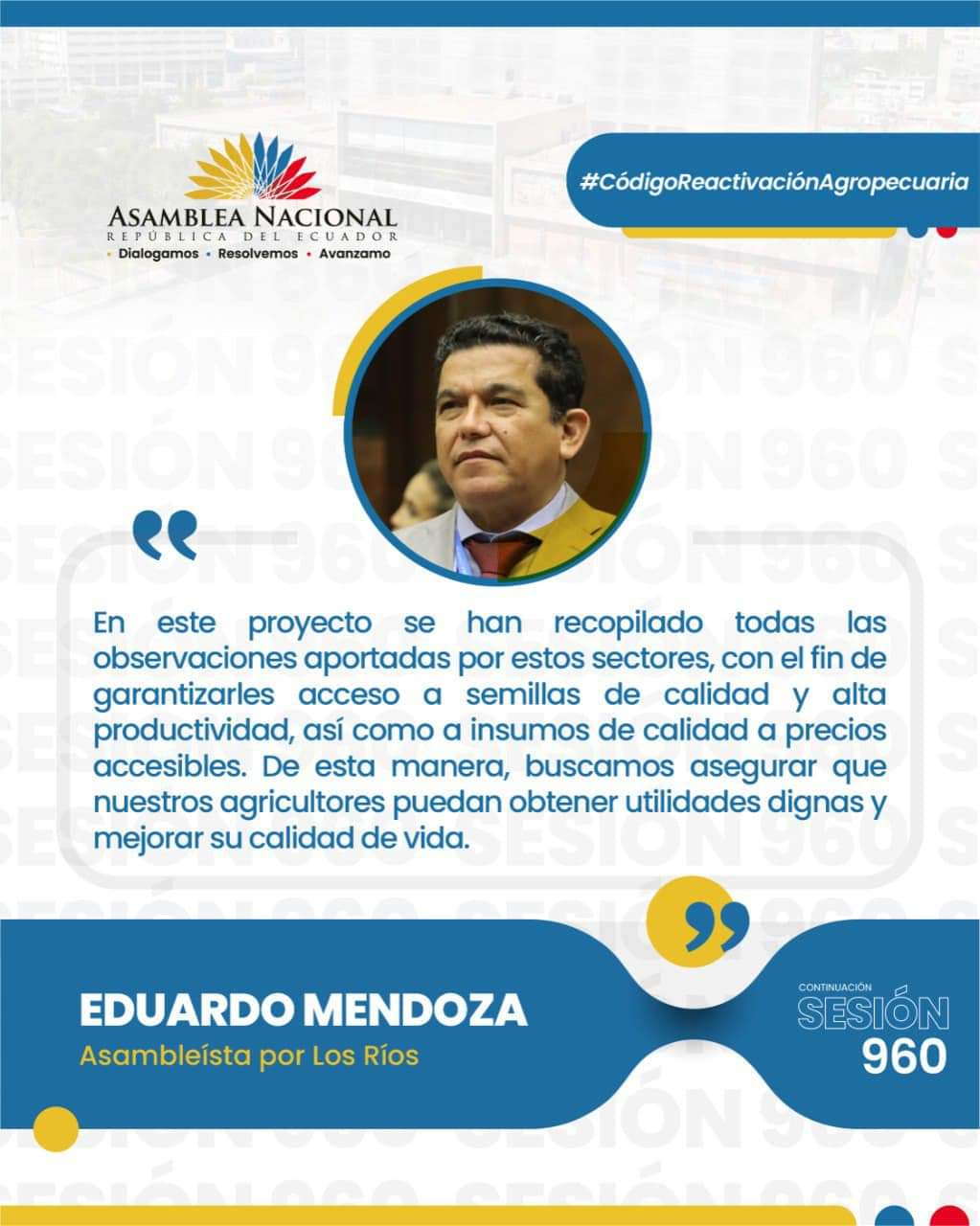 Amy Gende destacó la importancia de la iniciativa que propicia el regreso de los jóvenes a la agricultura y al comercio; también destacó el articulado de un precio justo para los productos agrícolas y ganaderos. Otto Vera dijo que, "es importante que el Código de Reactivación Agropecuaria fomente y fortalezca la investigación científica en la actividad agrícola, para ser más eficientes y que, cuando exista la cosecha, el costo sea menor y seamos competitivos en mercados internacionales", enfatizó.