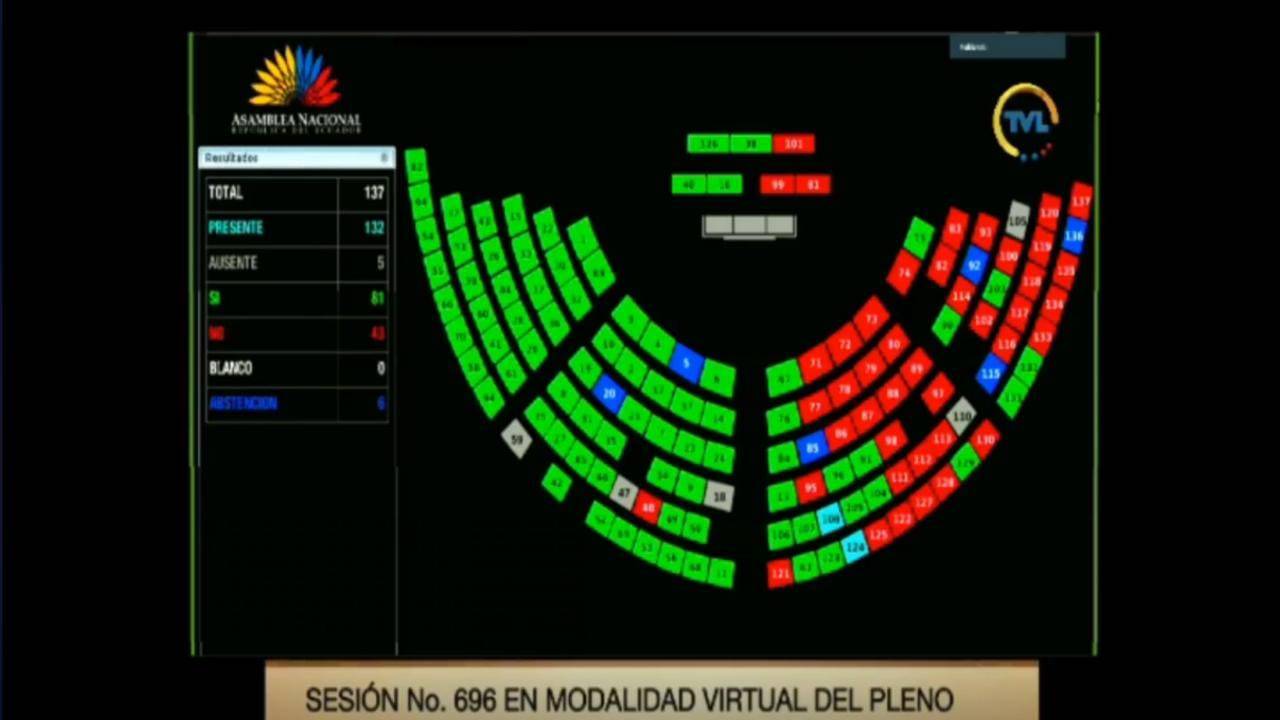 Los 129 asambleístas presentes en la sesión 696 del Pleno en modalidad virtual, 49 votaron a favor, 53 en contra, 27 abstenciones y 0 en blanco.