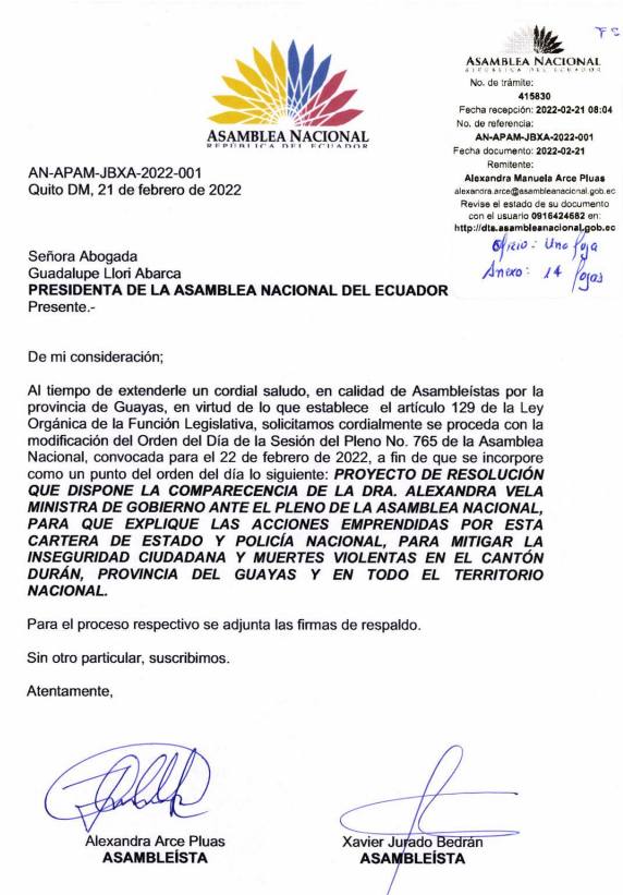 El pasado 22 de febrero de 2022, aprobamos el cambio del orden del día propuesto junto a mi compañera Alexandra Arce, para solicitar la comparecencia de la ministra de gobierno ante el pleno de la Asamblea Nacional, para que explique las acciones implementadas por parte del Gobierno Nacional para frenar la crisis de inseguridad en el Guayas y en todo el territorio nacional.