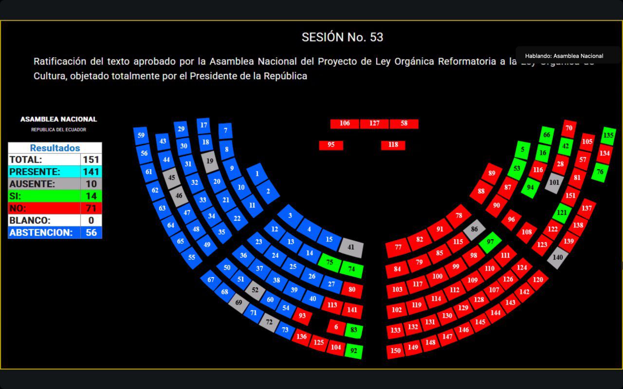 Luego de transcurrido un año, de conformidad con el artículo 64 de la Ley Orgánica de la Función Legislativa (LOFL), el Pleno de la Asamblea Nacional trató la objeción total al proyecto de Ley Orgánica Reformatoria a la Ley Orgánica de Cultura, cuya moción de ratificación no fue aprobada.