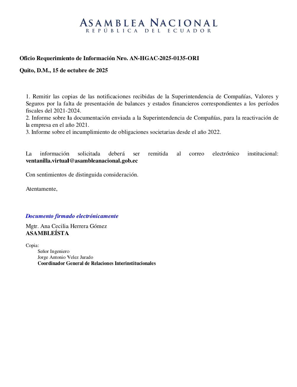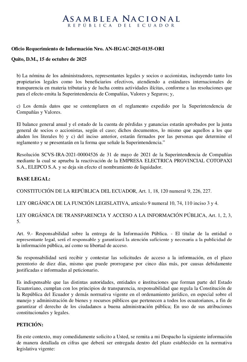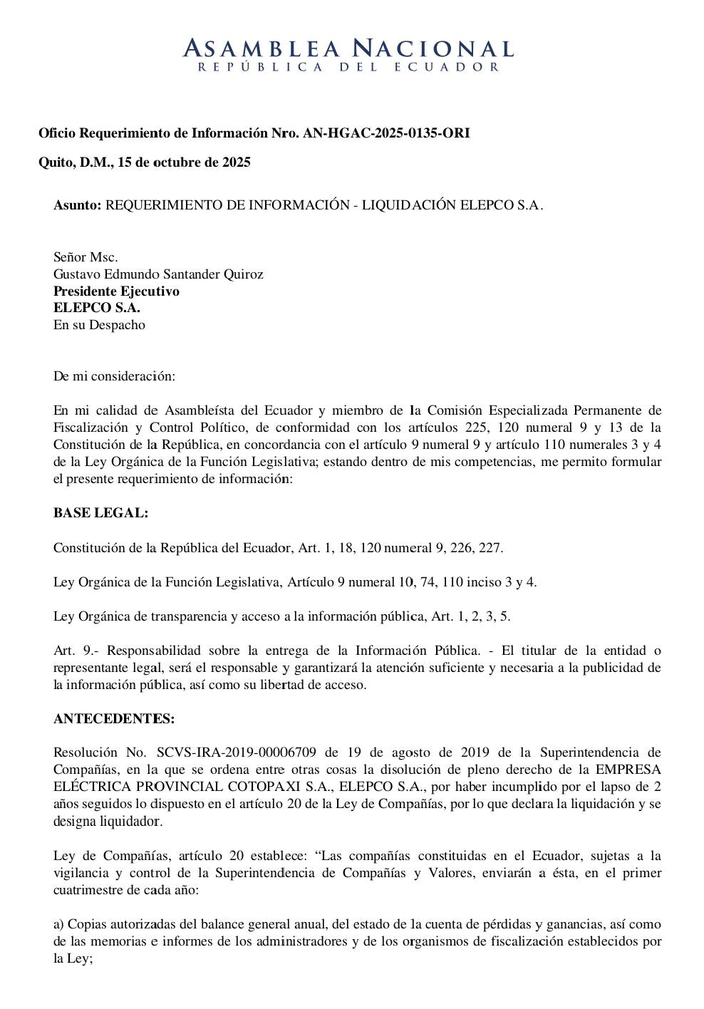 Como Asambleísta por Cotopaxi, mi deber es fiscalizar. Por esta razón el 01 de diciembre de 2023 emití un Requerimiento de Información Nro. AN-HGAC-2023-0002-ORI; ante el grave y recurrente incumplimiento de ELEPCO S.A. en la presentación de sus balances y estados financieros, tal como lo exige el artículo 20 de la Ley de Compañías. Los antecedentes son alarmantes, la empresa ya fue declarada en disolución en el 2019 por esta misma falta de transparencia, lo que evidencia un riesgo latente.