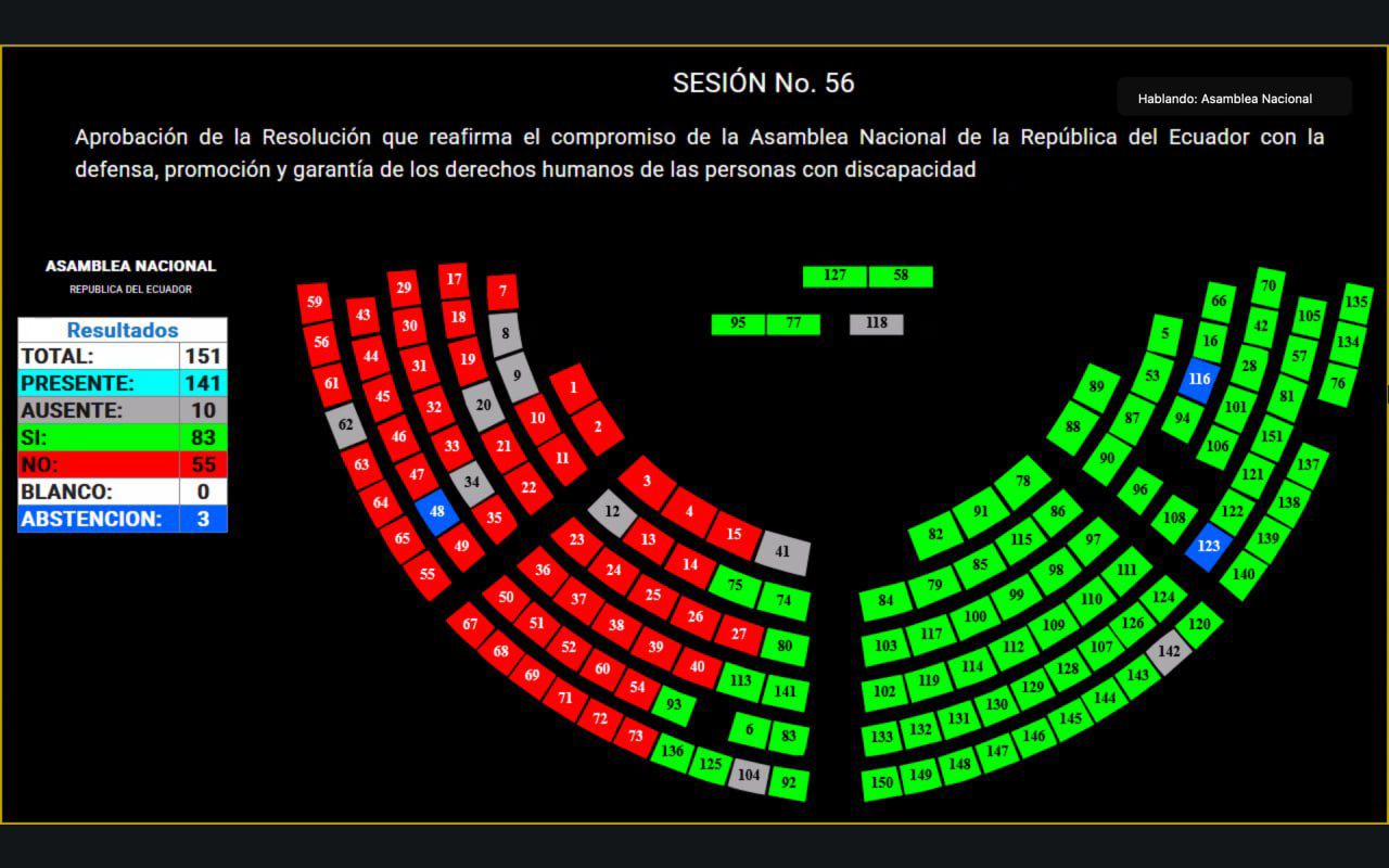 El Pleno de la Legislatura, este martes 9 de diciembre, con 83 votos afirmativos, aprobó la resolución por la cual se reafirma el compromiso de la Asamblea Nacional de la República del Ecuador con los derechos, la inclusión y el bienestar de las personas con discapacidad, así como con el fortalecimiento de políticas públicas inclusivas. Esta decisión se enmarca en la conmemoración del 3 de diciembre, establecido por la Organización de Naciones Unidas (ONU) como el Día Internacional de las Personas con Discapacidad.