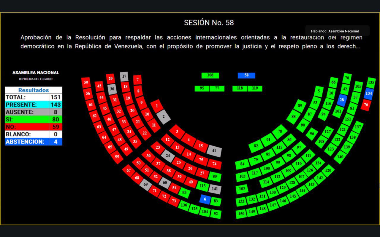 El texto de la resolución también señala que los ciudadanos ecuatorianos defienden la democracia, la voluntad soberana, el orden constitucional, la paz, la justicia y las libertades. De igual manera, condena enérgicamente la represión ejercida por el gobierno de Nicolás Maduro contra sus ciudadanos críticos, así como sus erradas políticas públicas, que han provocado el éxodo de millones de venezolanos, quienes han sido despojados de sus derechos esenciales.