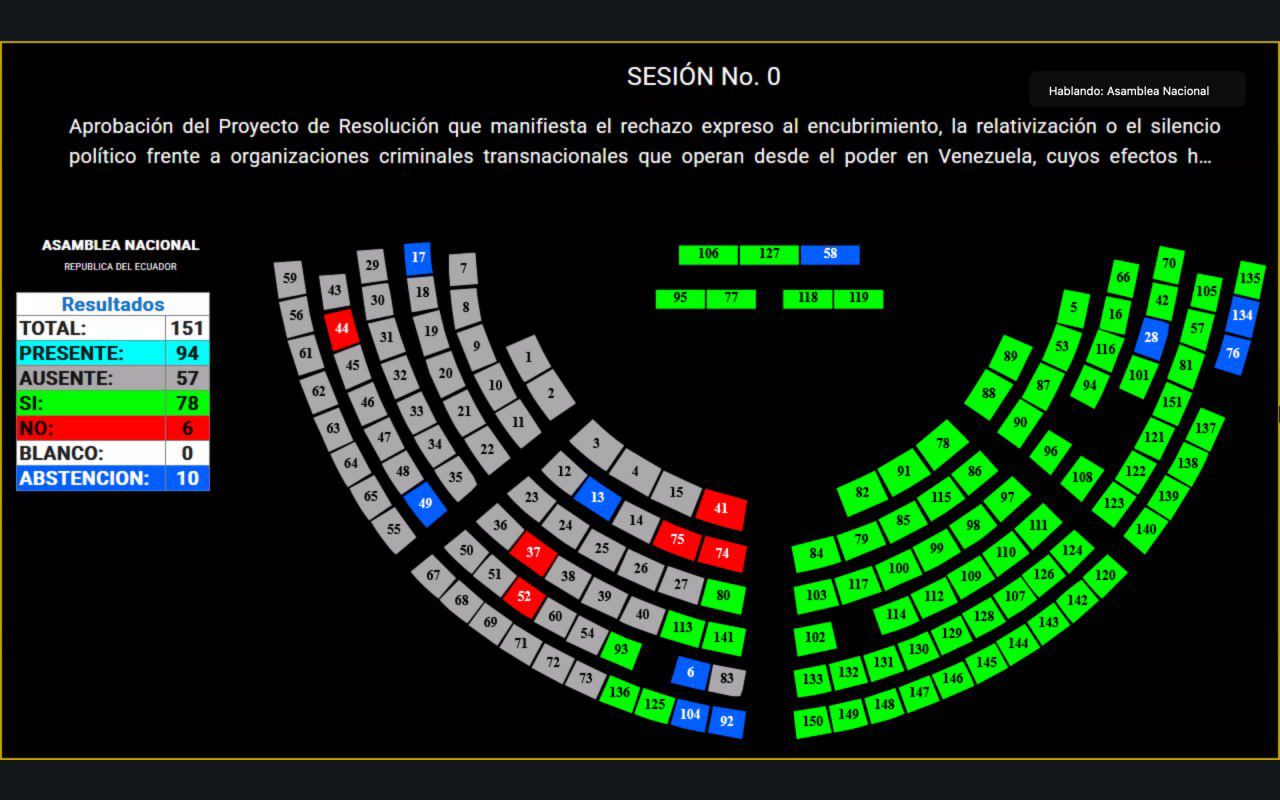 La resolución manifiesta el rechazo del Legislativo ecuatoriano al encubrimiento, la relativización o el silencio político frente a organizaciones criminales transnacionales que operarían desde el poder en Venezuela, cuyas acciones —según se expone— han tenido impactos directos en el Ecuador, como la expansión del narcotráfico, el fortalecimiento del crimen organizado y el incremento del desplazamiento forzado de ciudadanos venezolanos, afectando la seguridad y la paz social del país.