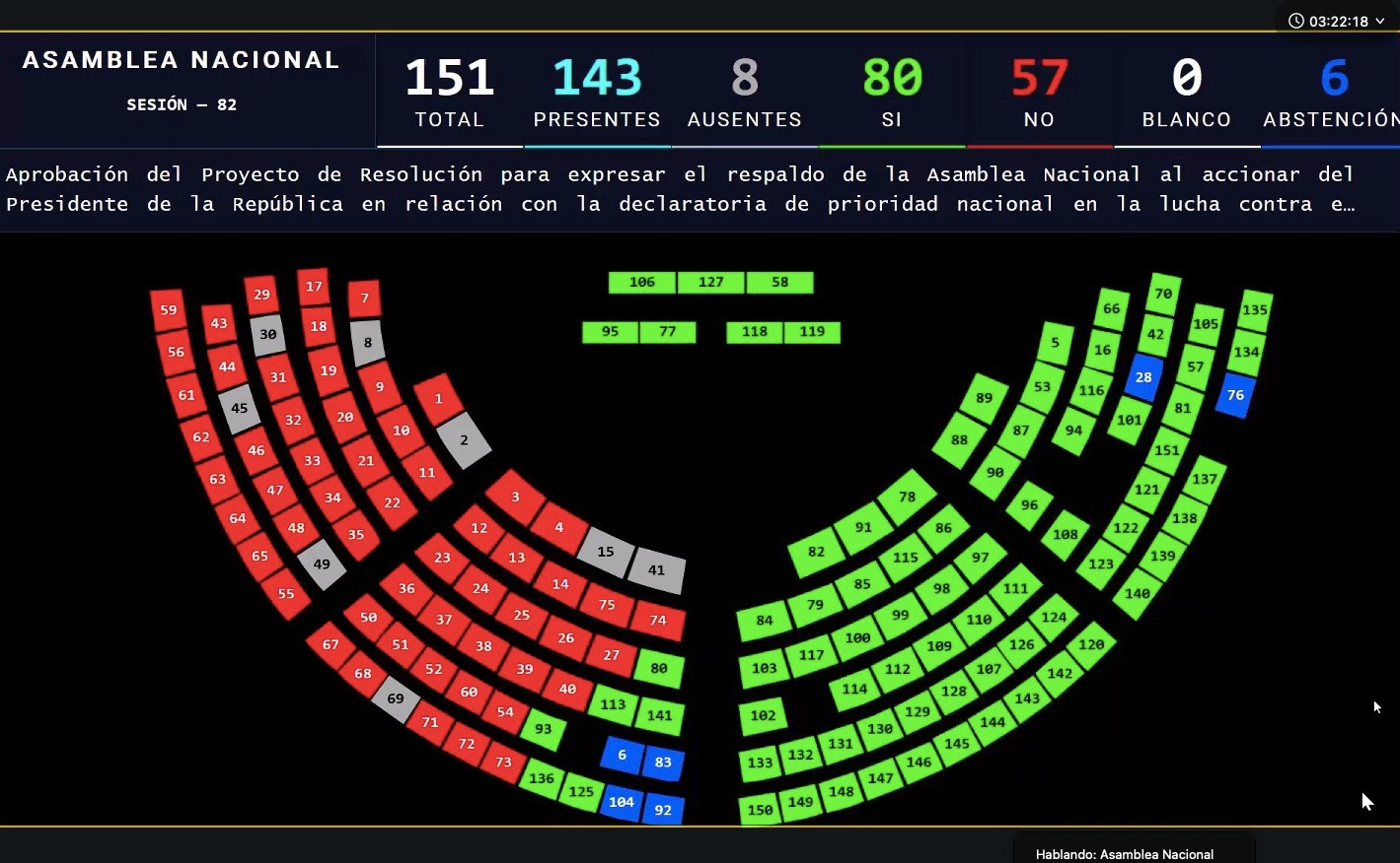 El Pleno de la Asamblea Nacional aprobó, con 80 votos afirmativos, una resolución mediante la cual expresa su respaldo al accionar del Presidente de la República en relación con la declaratoria de prioridad nacional en la lucha contra el narcoterrorismo y la minería ilegal, a fin de realizar operaciones conjuntas con los aliados estratégicos regionales, relativas a la justicia y dignidad nacional de los ecuatorianos.
