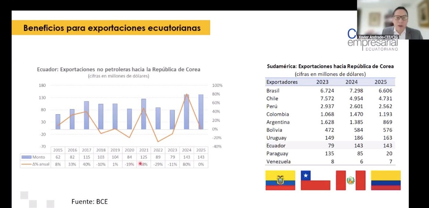 En materia de exportaciones, indicó que Ecuador ha mantenido un crecimiento promedio anual del 11 % hacia Corea del Sur en los últimos años, con una oferta centrada en productos como banano, camarón, cacao, flores, café, minerales y pesca. Asimismo, resaltó el crecimiento de exportaciones industrializadas, incluyendo productos químicos, farmacéuticos y elaborados agrícolas.