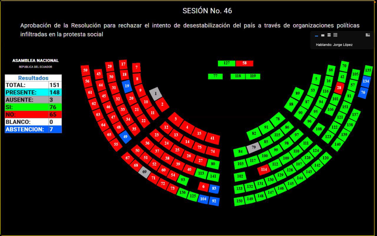 Con 76 votos, el Pleno de la Asamblea Nacional aprobó la resolución presentada por la asambleísta Diana Jácome Silva, que dispone rechazar el intento de desestabilización del país a través de organizaciones políticas infiltradas en la protesta social.