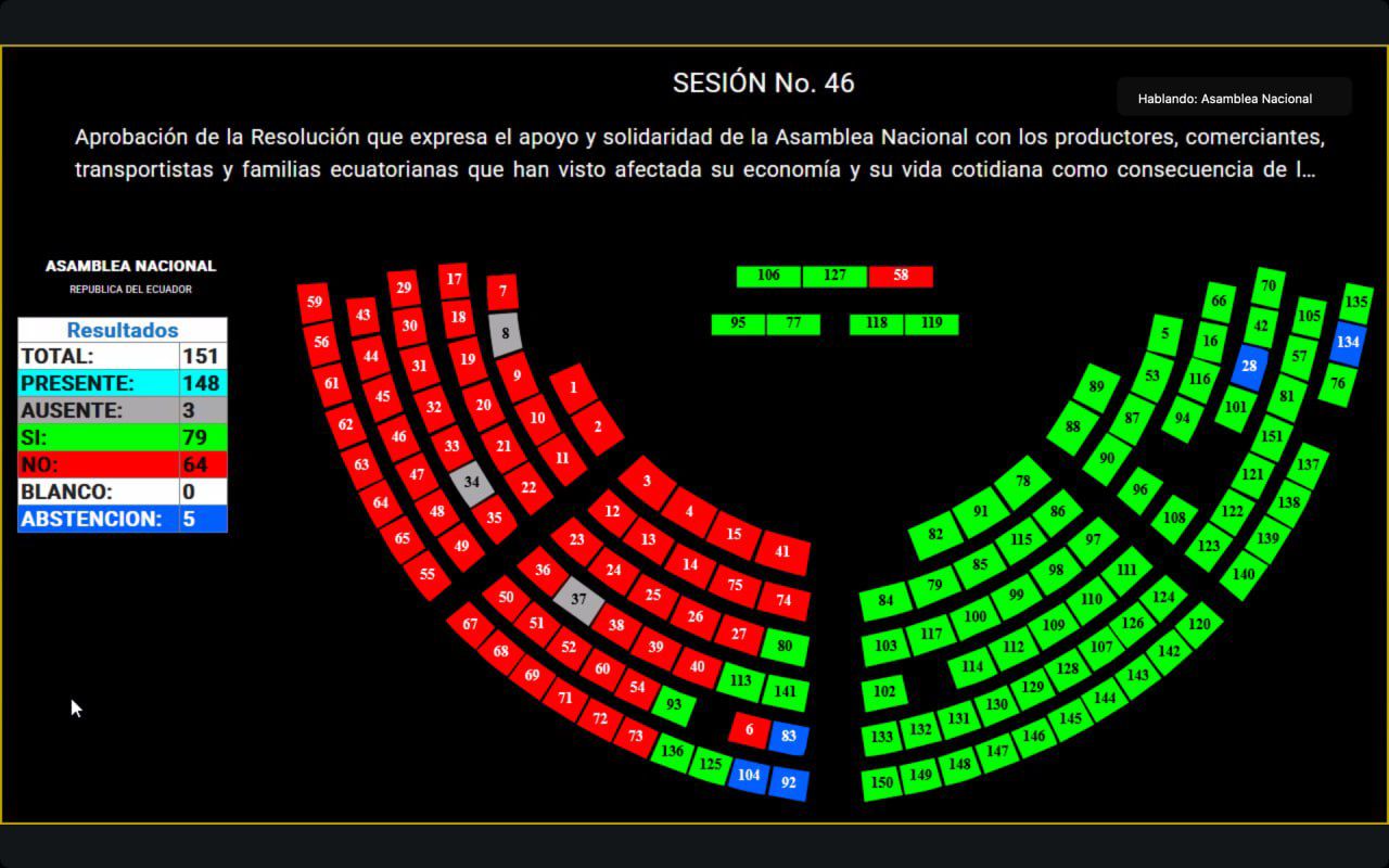 El Pleno de la Legislatura, este lunes, 13 de octubre, con 79 votos afirmativos, expresó el apoyo y solidaridad de la Asamblea Nacional con los productores, comerciantes, transportistas y familias ecuatorianas que han visto afectada su economía y su vida cotidiana como consecuencia de las paralizaciones y hechos violentos; y recomendó abstenerse de ejercer toda forma de violencia y vandalismo que atente contra la paz social, el derecho al trabajo, la movilidad y la seguridad de los ecuatorianos.