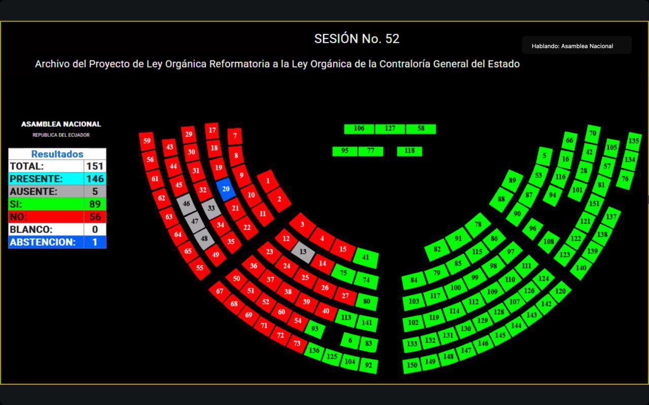 El Pleno de la Asamblea Nacional, con 89 votos afirmativos, archivó el proyecto de reformas a la Ley Orgánica de la Contraloría General del Estado. La decisión acogió el criterio de la Comisión de Justicia y Estructura del Estado que advirtió que los cambios planteados en lugar de fortalecer el sistema de control, podían generar un debilitamiento de las facultades y atribuciones del principal órgano de control de la gestión y uso de recursos del Estado.