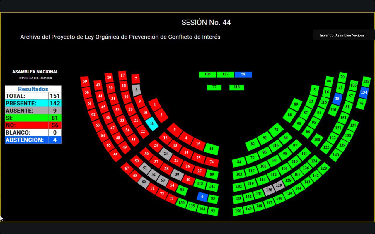 El Pleno de la Asamblea Nacional, con 81 votos afirmativos, resolvió archivar el proyecto de Ley de Prevención de Conflicto de Interés, debido a que contiene normas incompatibles que podrían colisionar con la Constitución de la República, el Código Orgánico Integral Penal (COIP) y la Ley Orgánica de Servicio Público (LOSEP), lo que afectaría la unidad y coherencia del ordenamiento jurídico.
