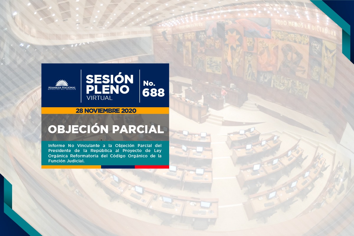 El Pleno de la Asamblea, en el marco de la sesión 688 cumplida este sábado, 28 de noviembre, inició el trámite de la objeción parcial del presidente de la República, Lenín Moreno Garcés, a la Ley Orgánica Reformatoria al Código Orgánico de la Función Judicial, que tiene por objetivo fortalecer la independencia, transparencia, lucha contra la corrupción y una mejora institucional de tan importante función del Estado.